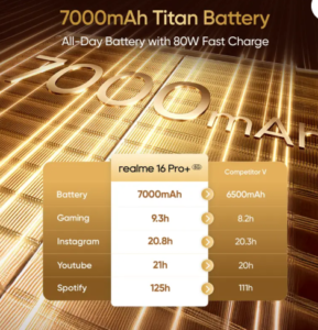 The Realme 16 Pro+ is powered by a massive 7000mAh Titan Battery with 80W fast charging, offering all-day power and extended usage for gaming, video streaming, and music playback. This high-capacity battery ensures long-lasting performance with minimal downtime, making it ideal for heavy smartphone users.