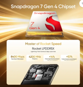 • • Runs on a MediaTek Dimensity 7300 Max 5G chipset — solid for everyday apps and light gaming, but not a flagship-level performer.